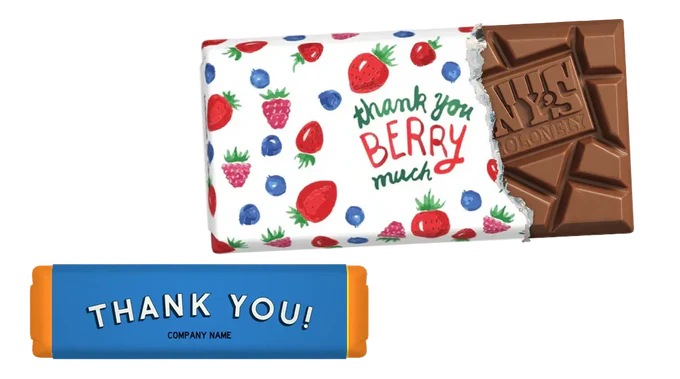 Het moet makkelijk zijn om gepersonaliseerde chocolade te maken. En leuk ook. Dus hebben we 't precies zo gemaakt. Upload een foto, voeg een naam toe, zet er een logo op en schrijf een persoonlijke boodschap op de wikkel.